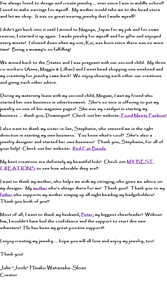 creating my jewelry ... hope you will all love and enjoy my jewelry, too!Thank you!Julie "Joolz" Hisako Watanabe-Sloan Creator